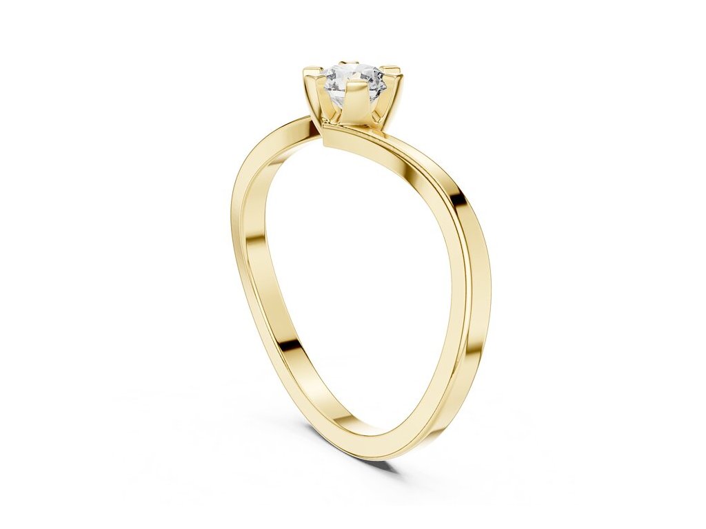 Zlatý prsteň "Elia" vás očarí svojím nežným a moderným vzhľadom. Na rozdiel od klasických rovných prsteňov má tento model jemne vlnitý profil, ktorý elegantne obtáča centrálny kameň.