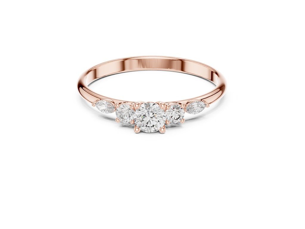 Prsteň "Tess" je jemná, no výrazná kombinácia klasiky a moderného dizajnu. Dominantou je centrálny okrúhly diamant, ktorý je doplnený bočnými kameňmi v elegantnom tvare marquise. Táto kombinácia vytvára harmonický, vyvážený vzhľad a zároveň opticky zvýrazňuje veľkosť hlavného diamantu.